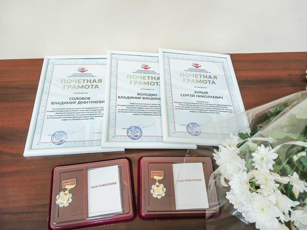 Свои приветственные слова участникам события адресовали и другие члены президиума научно-практической конференции. А медицинских работников также поощрили Почетными грамотами региональной общественной организации взаимодействия медицинских работников «Врачебная палата», Почетными грамотами обкома профсоюза. За свой труд медики также получили Почетные грамоты Федерации профсоюзов Брянской области и юбилейный знак «40 лет ликвидации аварии на Чернобыльской АЭС».